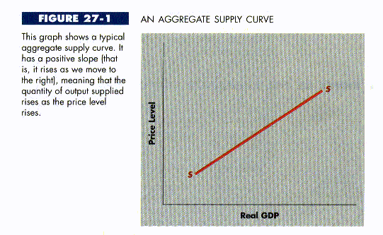 A typical aggregate supply curve is drawn in Figure 27-1. It slopes upward, meaning that as prices rise more output is produced, other things held constant. It is not difficult to understand why. Producers in the U.S. economy are motivated mainly by profit. The profit made by producing a unit of output is simply the difference between the price at which it is sold and the unit cost of production: