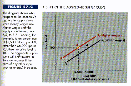While there are many inputs other than labor, the one that has attracted the most attention in recent decades is energy. Increases in the price of energy, such as those that took place in the early 1980s and again during the 1990 Gulf war, push the aggregate supply curve inward more or less as shown in Figure 27-2. By the same token, a rise in the price of any input we import from abroad would have the effect shown in the figure.