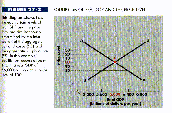 Figure 27-3 displays the mechanics. Aggregate demand curve DD and aggregate supply curve SS intersect at point E, where real GDP is $6,000 billion and the price level is 100. As can be seen in the graph, at any higher price level, such as 120, aggregate quantity supplied would exceed aggregate quantity demanded. There would be a glut on the market as firms found themselves unable to sell all their output. As inventories piled up, firms would compete more vigorously for the available customers, thereby forcing prices down. Both the price level and production would fall.