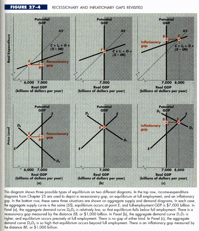 We could not give a complete answer to this question in Chapter 25 because we had no way to determine the equilibrium price level, and therefore no way to tell which type of gap, if any, would arise. The aggregate supply and demand analysis summarized in Figure 27-3 now gives us what we need. But we fir that our answer is the same as it was in Chapter 25--anything can happen.