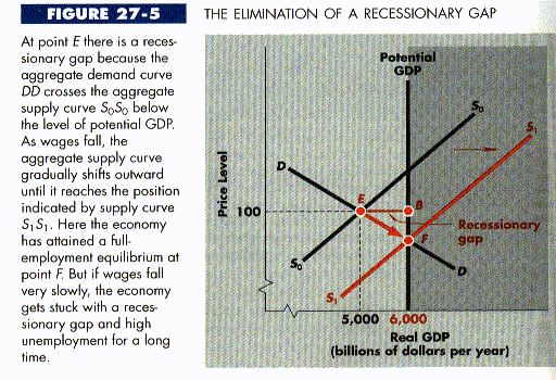 The implications of this rigidity are quite serious, for a recessionary gap cannot cure itself without some deflation. And if wages and prices will not fall, recessionary gaps like EB in Figure 27-5 will linger for a long time. That is: