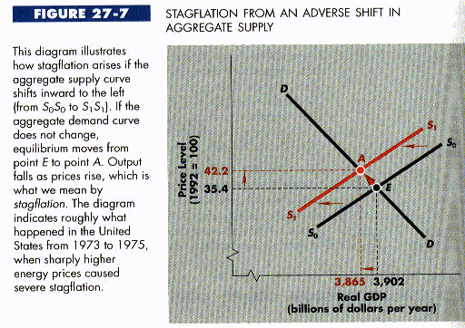 The numbers used in Figure 27-7 are roughly indicative of what happened in the United States after the big "energy shock" of late 1973. Between 1973 (represented by supply curve SoSo and point E) and 1975 (represented by supply curve S1S1 and point A), real GDP fell by about 1 percent, while the price level rose a stunning 19 percent. Thus, inflation soared and the economy weakened. The general lesson to be learned from the U.S. experience with supply shocks is both clear and important: