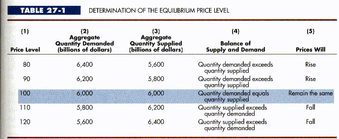 Table 27-1 illustrates the same conclusion in another way, using a tabular analysis similar to that of Chapter 25 (refer back to Table 25-2, page 597). Columns 1 and 2 constitute an aggregate demand schedule corresponding to the aggregate demand curve DD in Figure 27-3. Columns 1 and 3 constitute an aggregate sup. ply schedule corresponding exactly to aggregate supply curve SS in the figure.